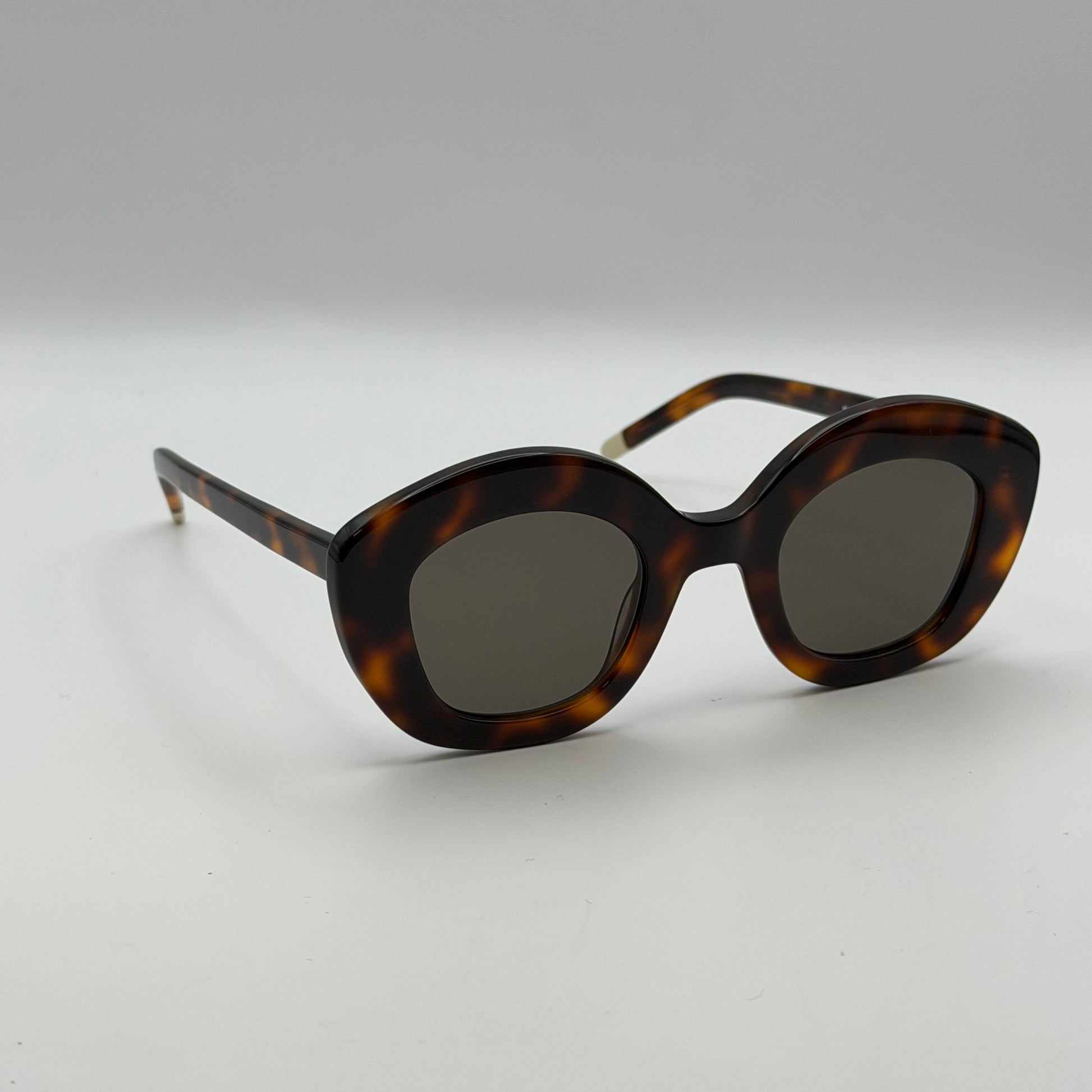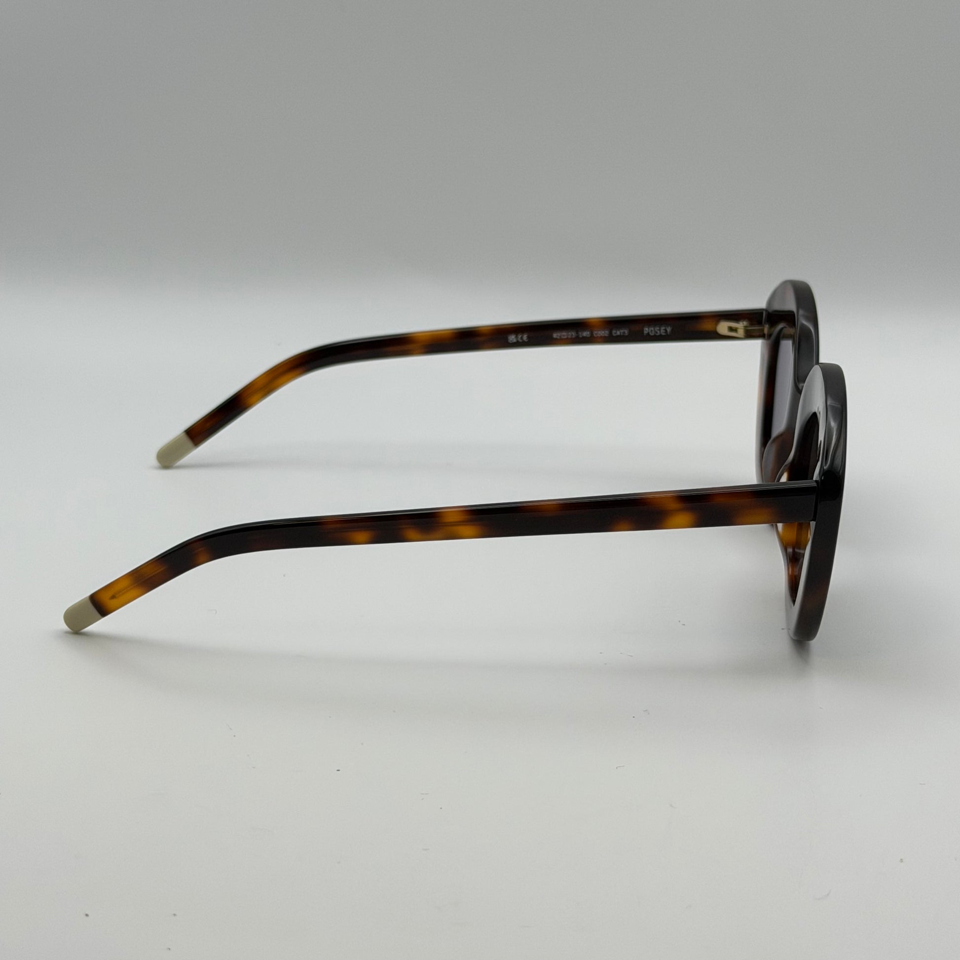 La monture entièrement réalisée en acétate havane marron dévoile un motif profond et lumineux typique des acétates haut de gamme. Cette teinte chaude met immédiatement en valeur les traits du visage et apporte une dimension vintage très tendance. Les branches, elles aussi en acétate havane, se terminent par des manchons beige translucides, un détail contrastant qui illumine la monture tout en ajoutant une pointe de modernité. Ce travail subtil sur les couleurs et les transparences renforce le caractère chic et intemporel des Posey Havane.